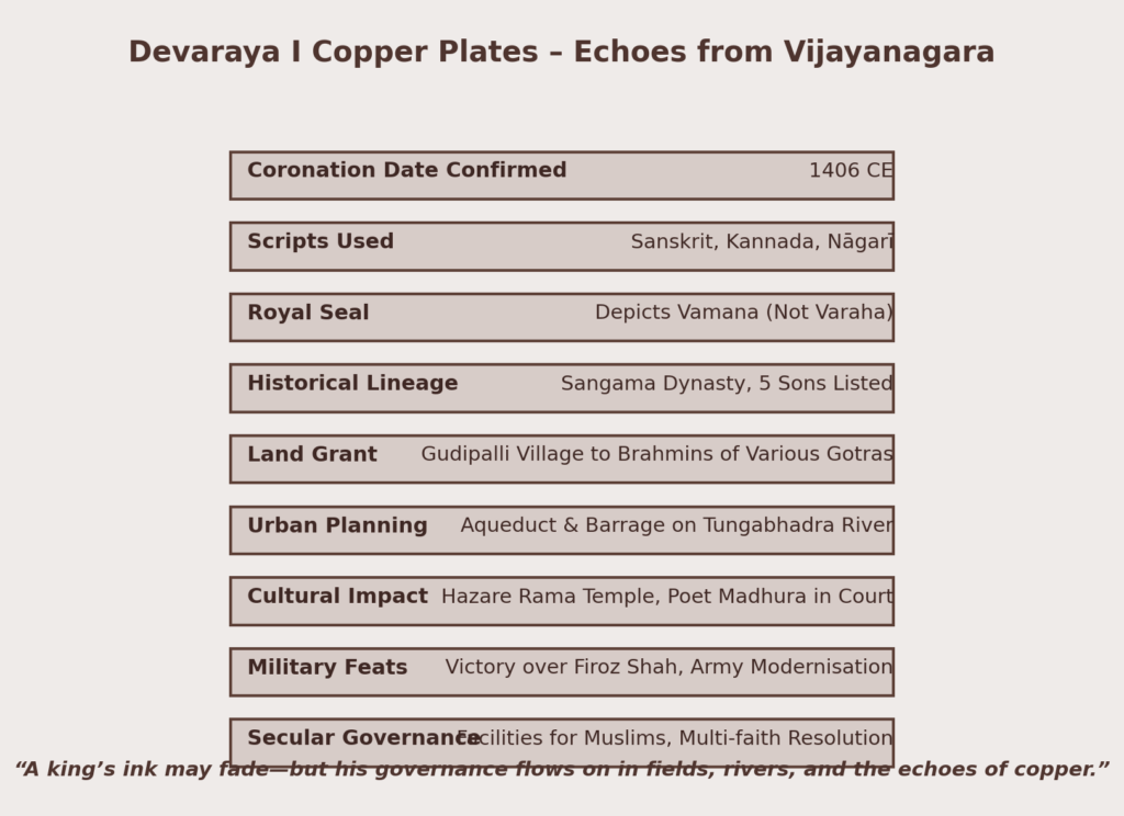 In a remarkable archaeological revelation, a set of copper plates issued in 1406 CE has been discovered—tracing their origin to the coronation of Devaraya I, one of the greatest rulers of the Vijayanagara Empire.