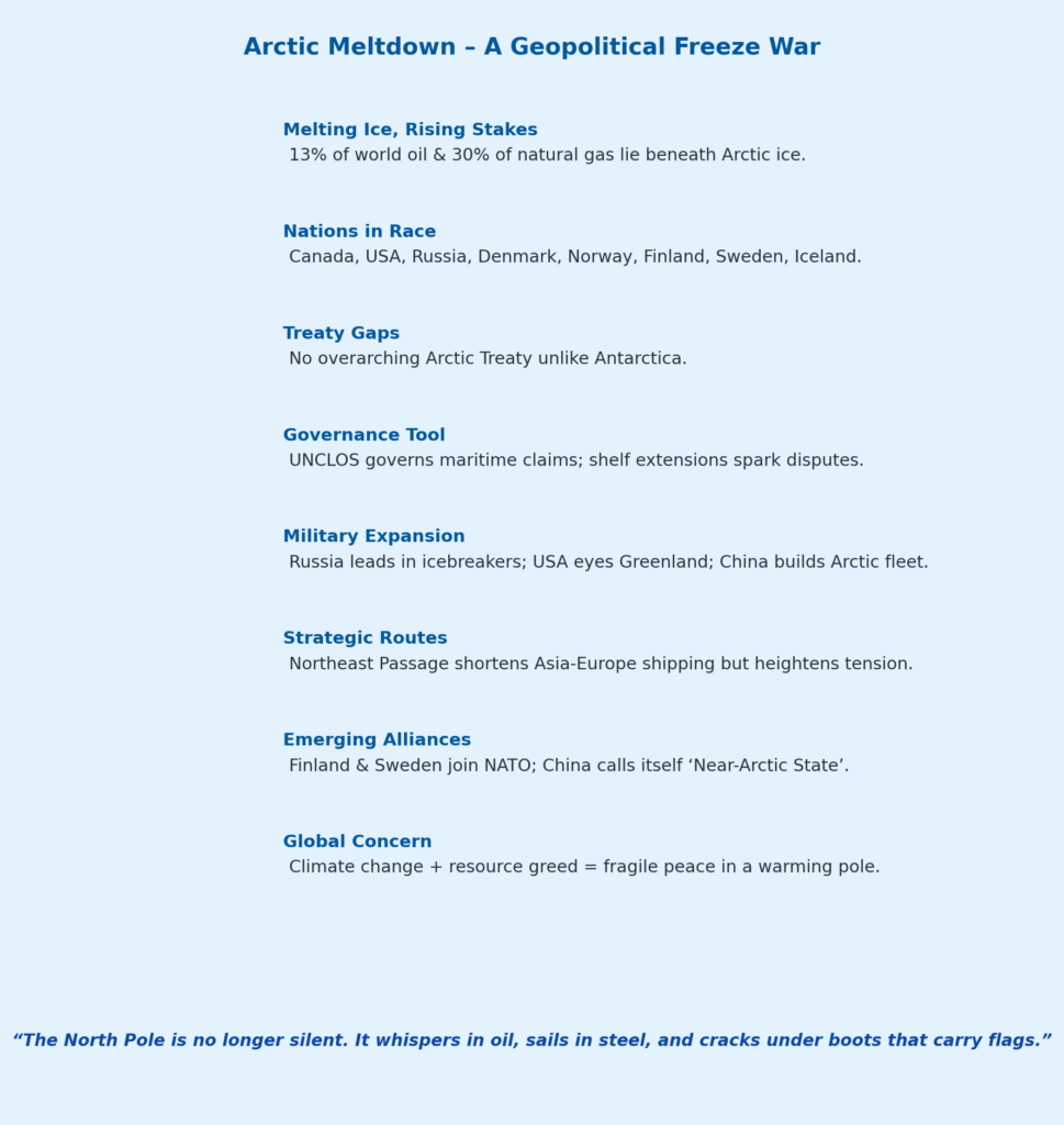 “The North Pole is no longer silent. It whispers in oil, sails in steel, and cracks under boots that carry flags.”