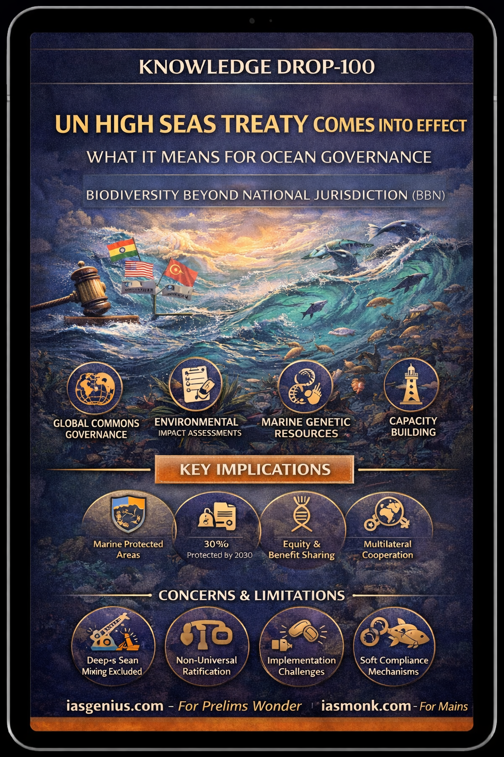 🌊 Knowledge Drop-100 | UN High Seas Treaty (BBNJ) Comes Into Effect: What It Means for Ocean Governance | IAS Prelims 2026-27 Highly Expected MCQs | Current Affairs & GS Essays on iasmonk.com