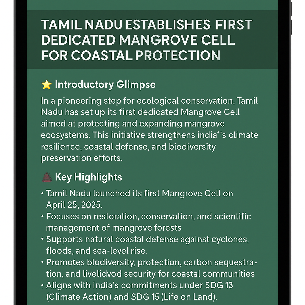 Read More🌱 Tamil Nadu Establishes First Dedicated Mangrove Cell for Coastal Protection 🧭 Thematic Focus: Environment | Coastal Ecosystems | Climate